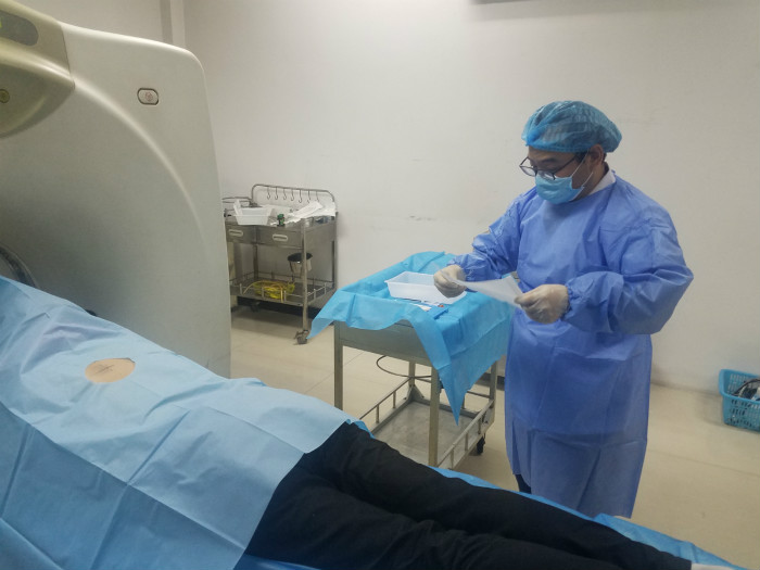 今年60歲的患者張某,因反復(fù)咳痰、喘氣20余年,間斷痰中帶血1年多,復(fù)發(fā)1月有余,于5月18日到廣安區(qū)人民醫(yī)院呼吸及危重癥醫(yī)學(xué)科住院治療。呼吸及危重癥醫(yī)學(xué)科專家醫(yī)生及放射科醫(yī)生一起認(rèn)真討論患者病情,通過深思熟慮的分析、縝密研究,積極為患者制定了合理的診療方案。6月4日,在放射科CT引導(dǎo)下經(jīng)皮穿刺進(jìn)入肺部病灶,采用活檢槍獲取病灶細(xì)胞組織標(biāo)本,取材滿意,術(shù)后患者狀況良好,無任何并發(fā)癥。此次肺穿刺活檢術(shù)標(biāo)志著廣安區(qū)人民醫(yī)院在肺部疾病診療技術(shù)方面又上一個(gè)新臺(tái)階。